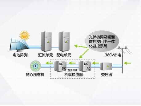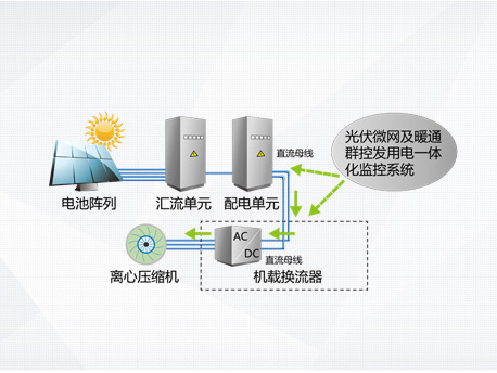 光伏發(fā)電系統(tǒng)不發(fā)電,主機向電網(wǎng)取電運行,機組相當于常規(guī)高效變頻離心機。