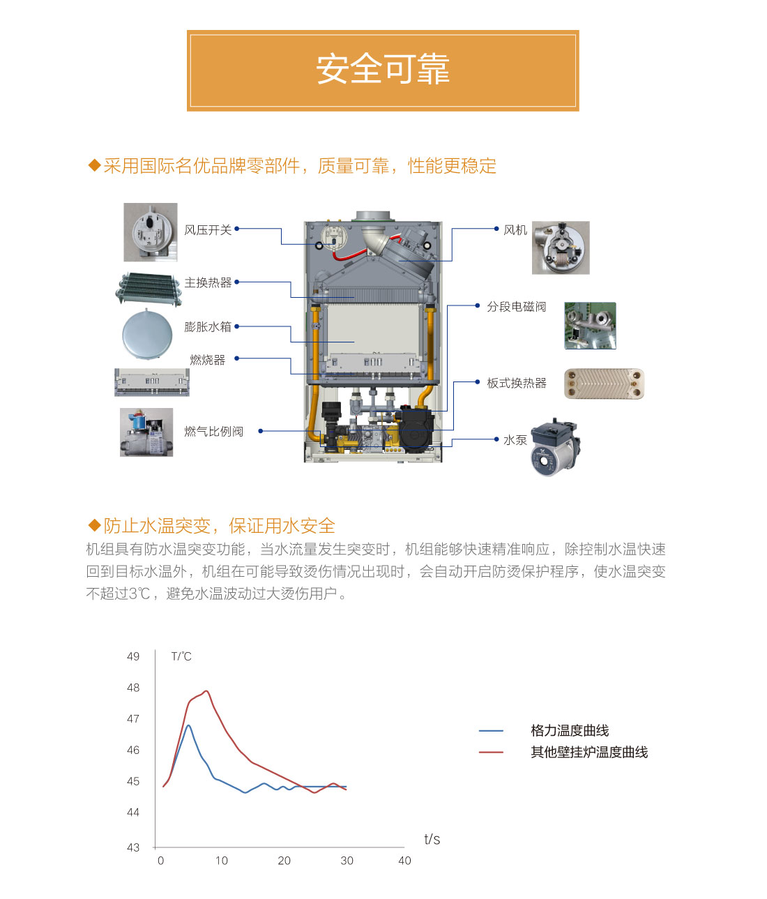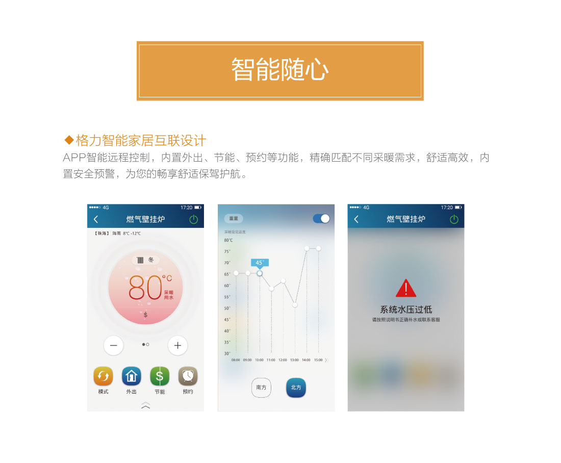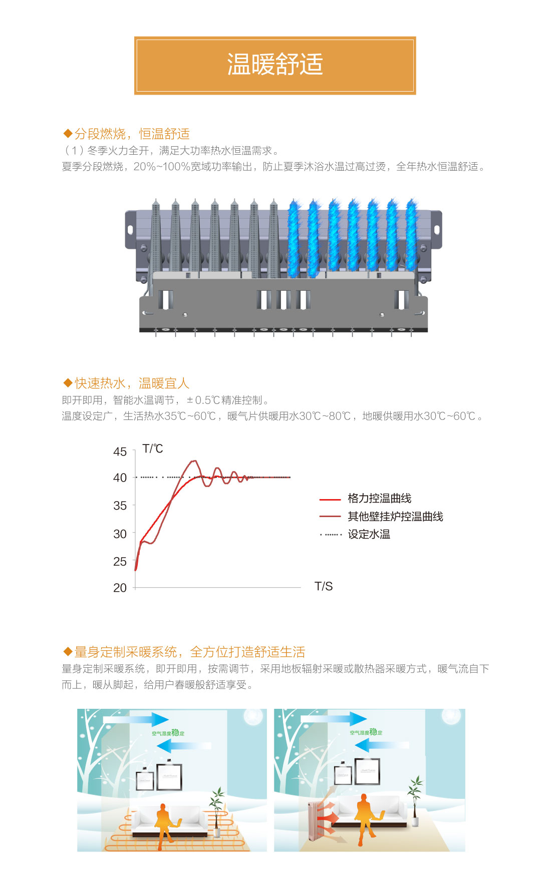 分段燃燒,20%~100%寬域功率輸出,防止夏季水溫過(guò)高過(guò)燙,智能水溫調(diào)節(jié),±0.5℃精準(zhǔn)控溫,溫度設(shè)定廣,生活熱水35℃~60℃,暖氣片供暖用水30℃~80℃,地暖供暖用水30℃~60℃
