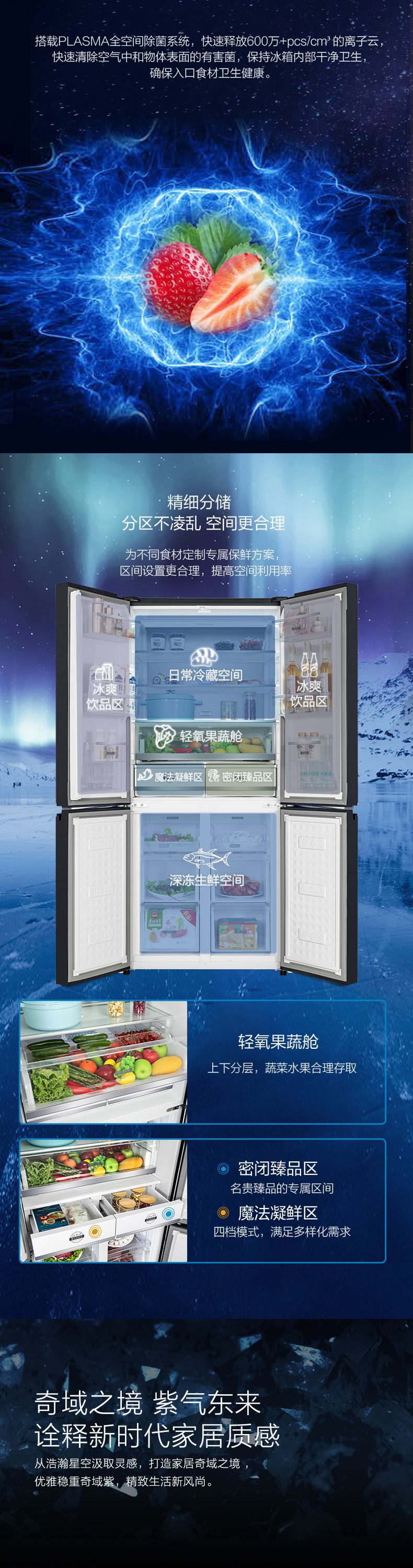 針對(duì)每種食材進(jìn)行精細(xì)化分區(qū),定制專屬保鮮艙,涵蓋肉類保鮮、果蔬保鮮、母乳儲(chǔ)存、干貨儲(chǔ)存以及除菌凈味五個(gè)維度,確保每一件食材的新鮮儲(chǔ)存