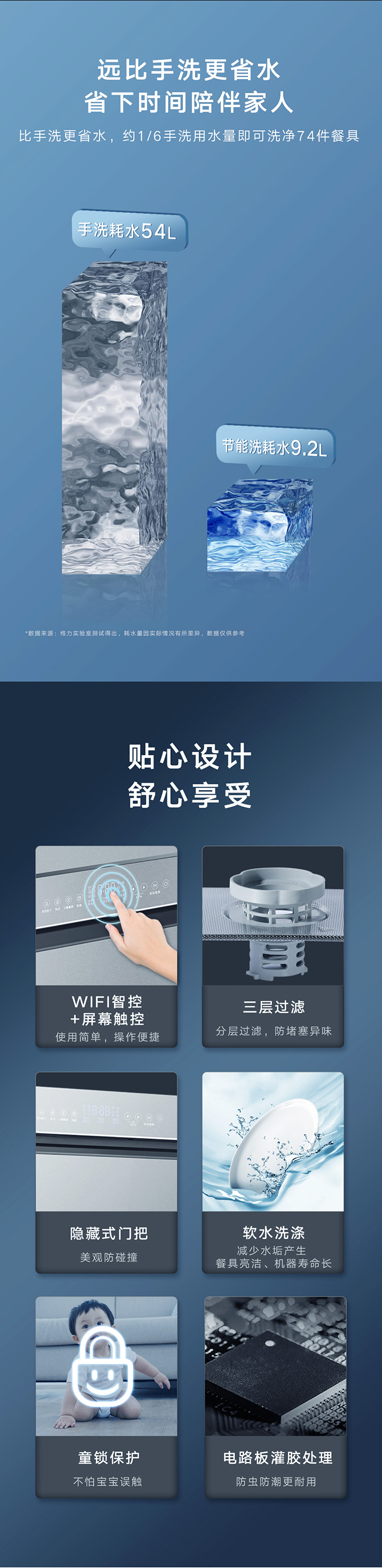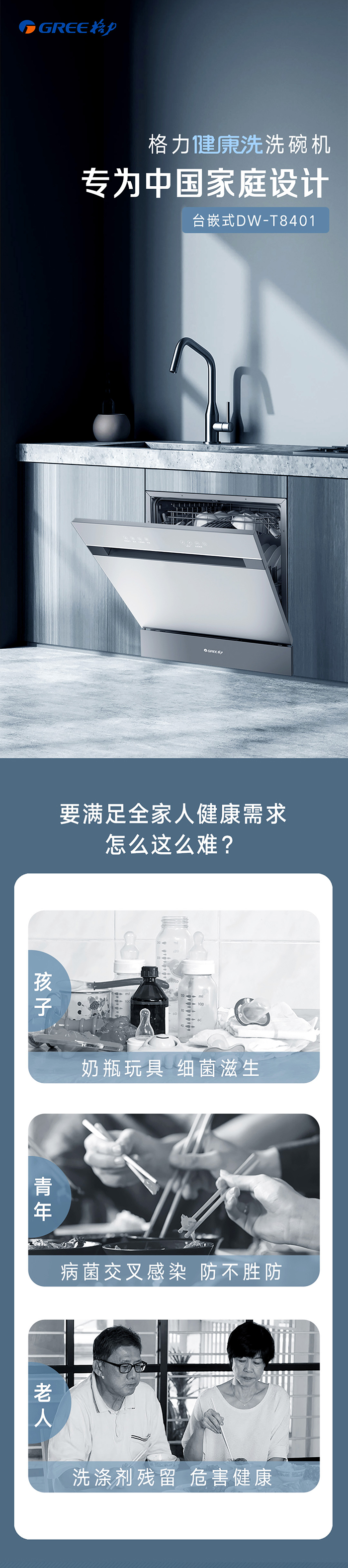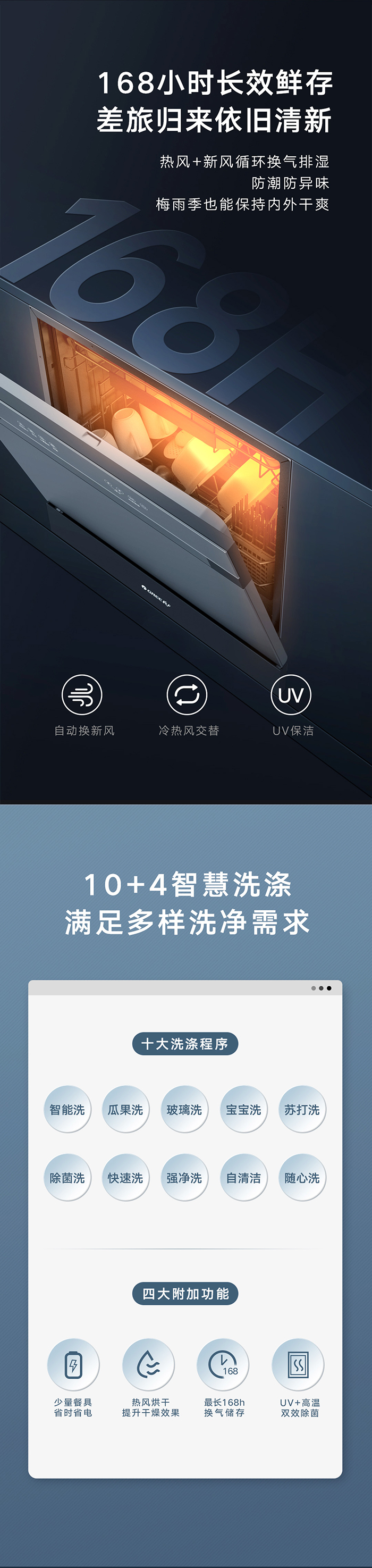 格力健康洗洗碗機(jī),專為中國家庭設(shè)計(jì);洗除排烘存更全能;熱風(fēng)循環(huán)烘干,內(nèi)腔餐具都干爽