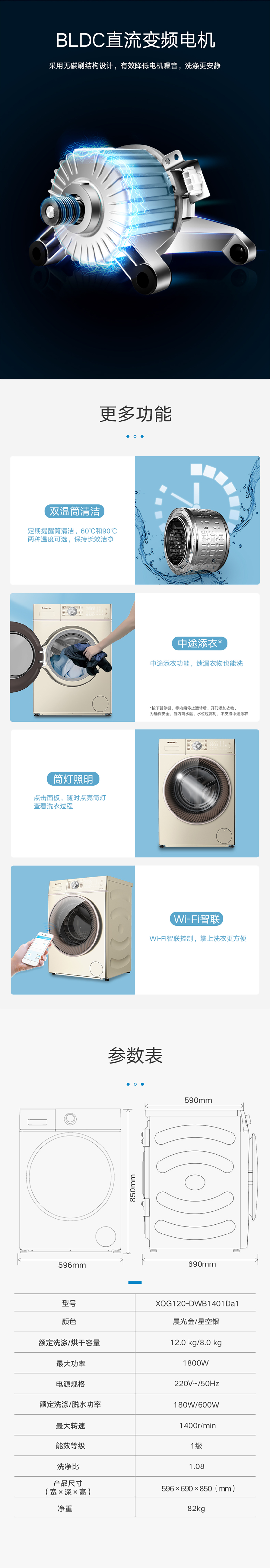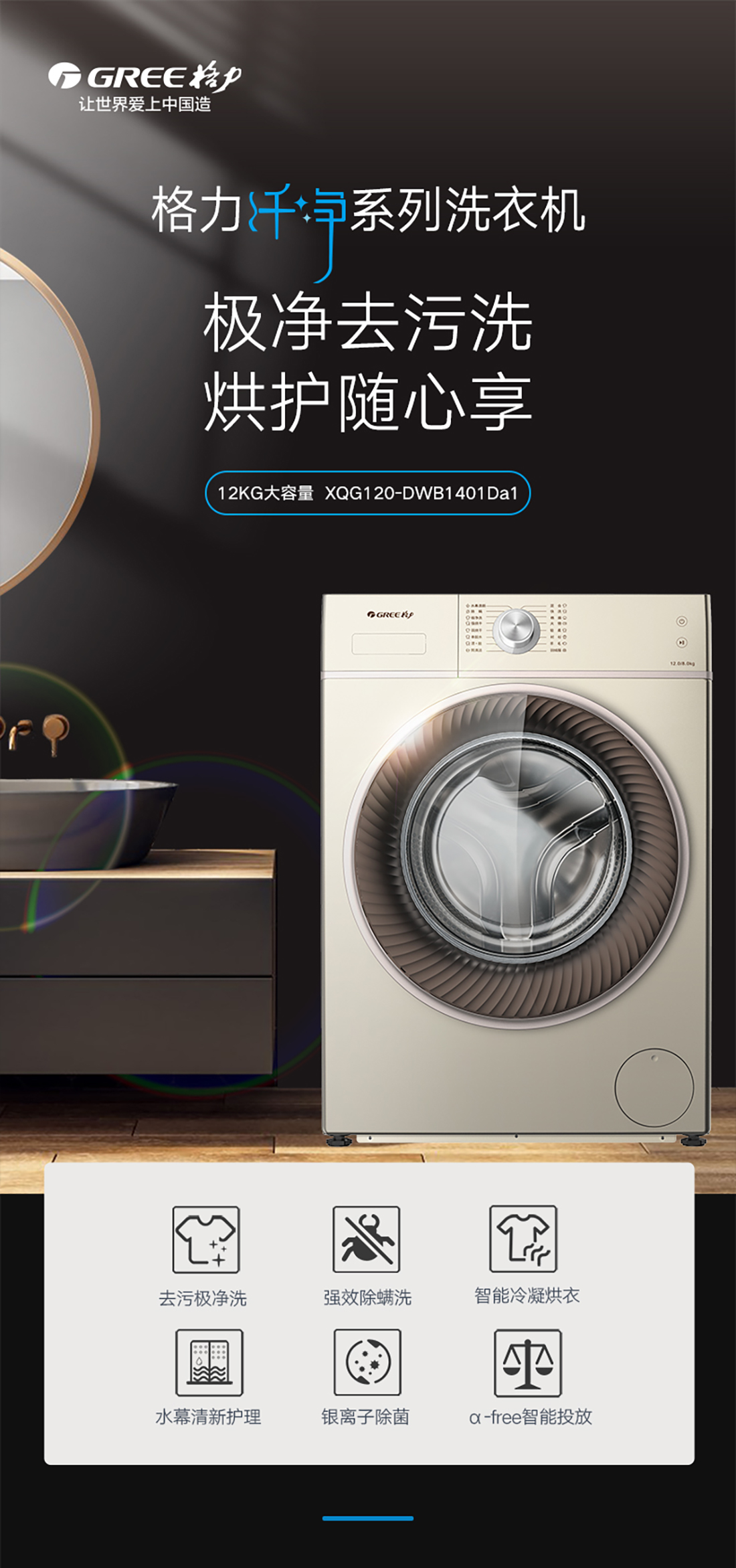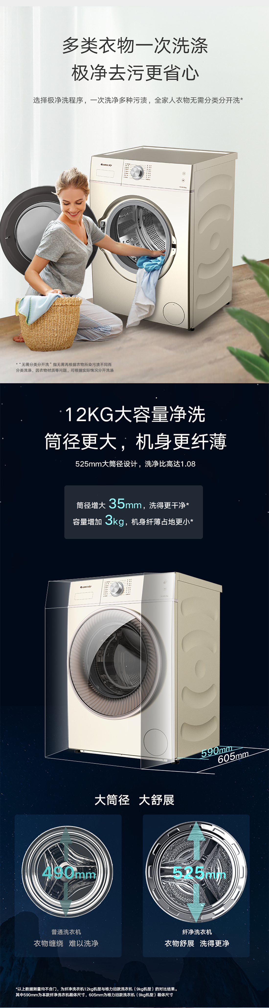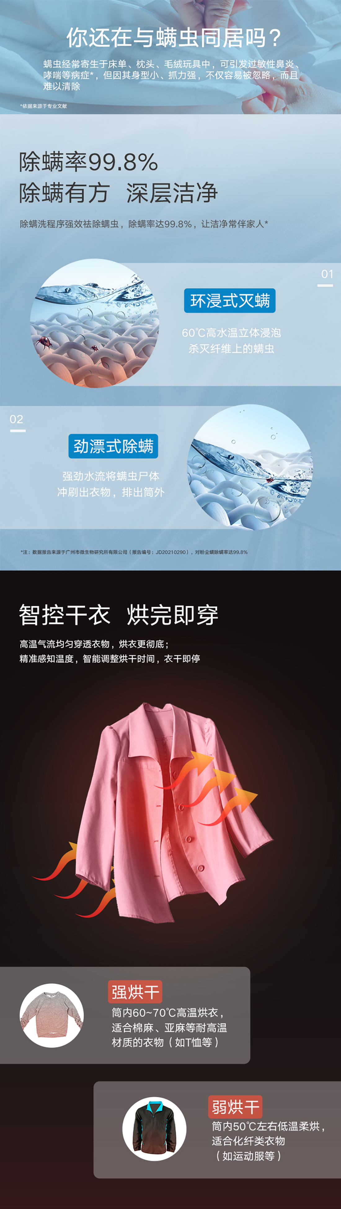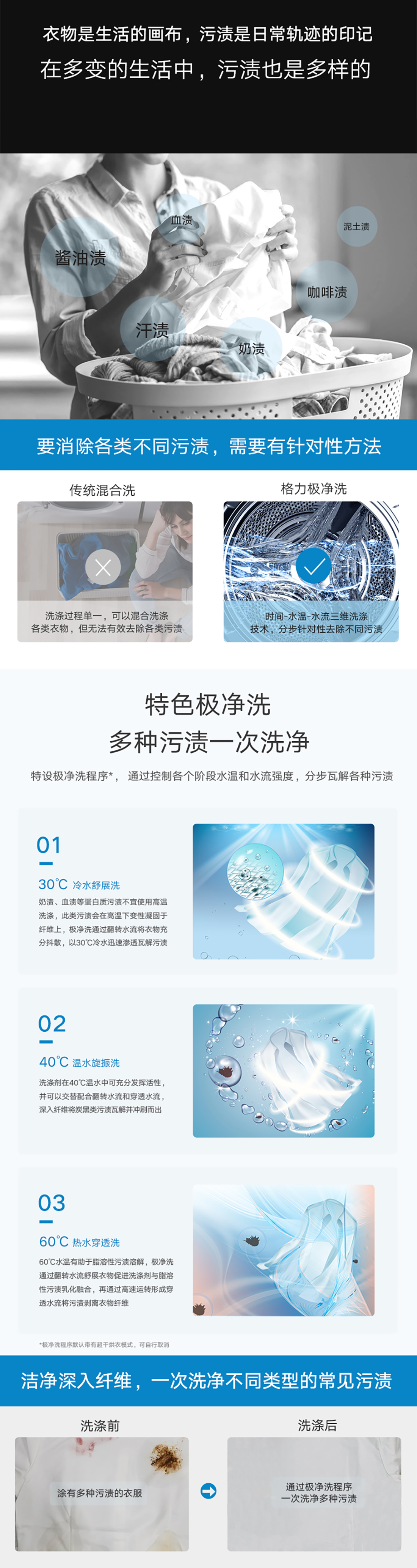 極凈去污,一次洗凈多類污漬;大容量,全家人衣物無(wú)需分類分開(kāi)洗;洗烘一體,即洗即烘即穿.