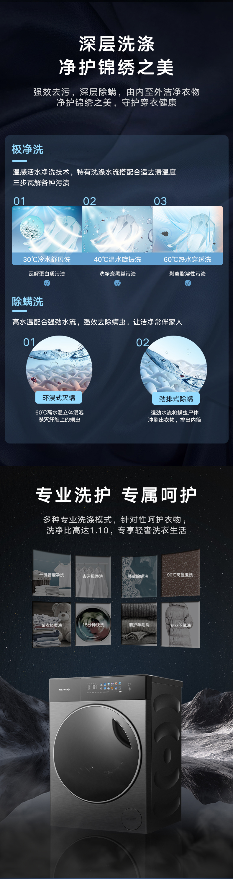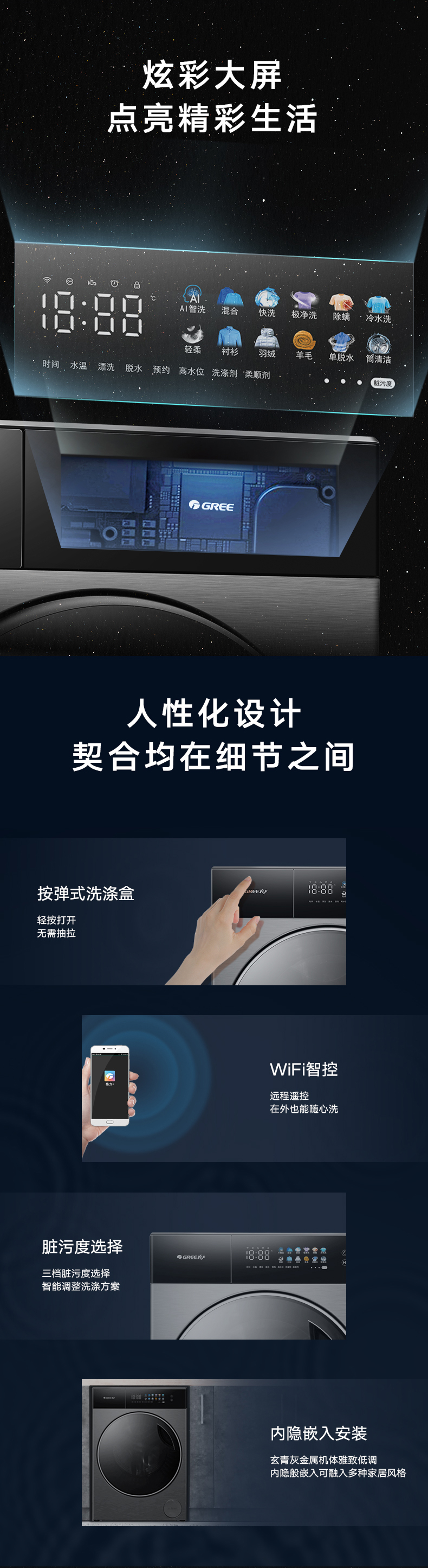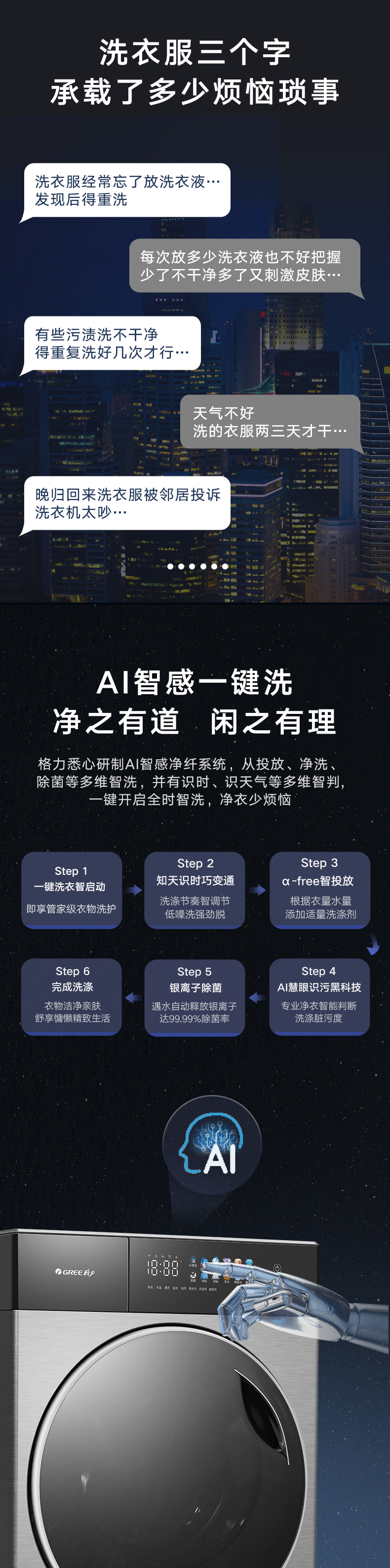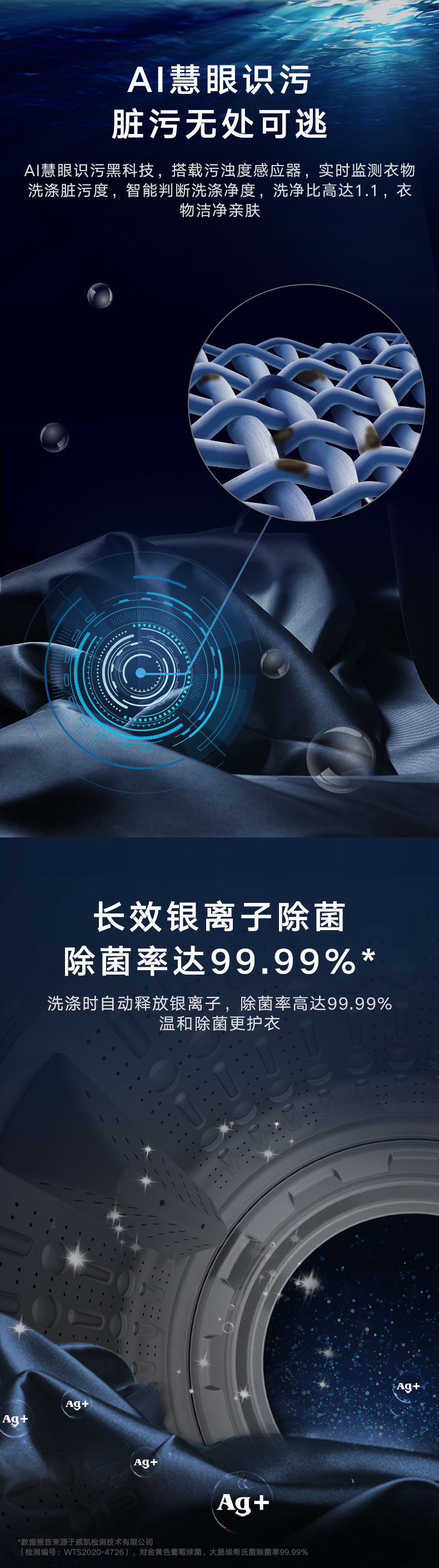 AI智能感應(yīng),臟污一鍵洗凈。AI慧眼識(shí)污,智能判斷洗滌凈度,洗凈比高達(dá)1.1